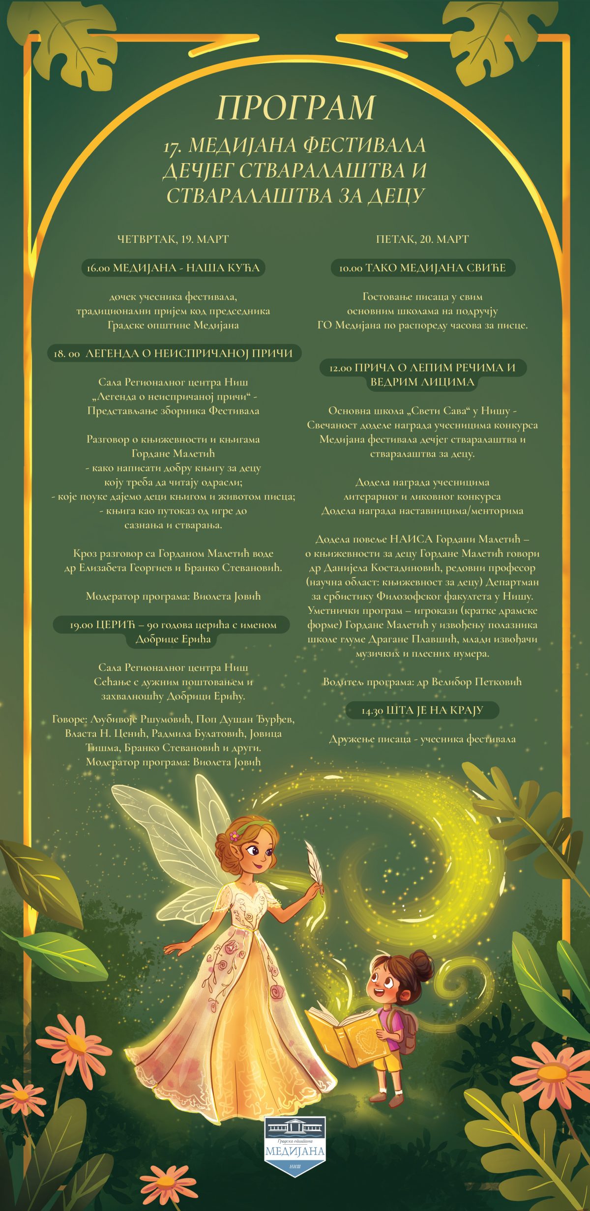Градска општина Медијана позива вас да будете део дводневног програма посвећеног књижевности, машти и таленту најмлађих. Фестивал доноси сусрете са истакнутим писцима, разговоре о књижевности, сећање на великане српске поезије, као и свечану доделу награда најуспешнијим младим ауторима.